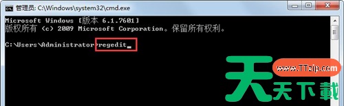 4、进入管理员界面,通过输入命令regedit打开注册表页面;