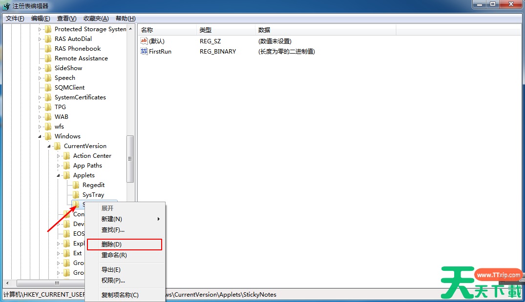 3、接着右击StickyNotes选择删除,最后重启电脑即可修复便签。