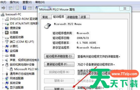 5、在鼠标属性页中,有关于驱动程序的详细信息,在最下面是一个卸载按钮,这就是卸载驱动的按钮,用鼠标点击这个卸载按钮,卸载当前的鼠标驱动;