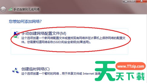 5、点击添加,弹出手动连接到无线网络窗口,选择第一个手动创建;