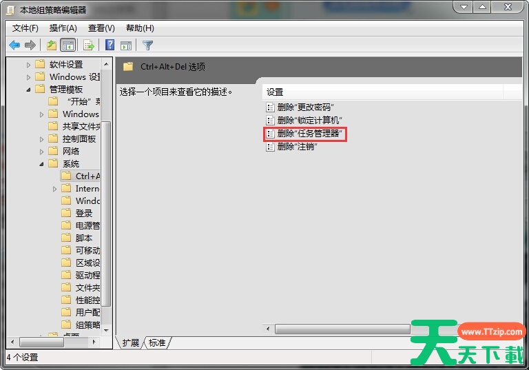 2、在打开的本地组策略编辑器中,依次展开用户配置 – 管理模板 – 系统 – Ctrl+Alt+Del选项中的“删除“任务管理器””双击打开。