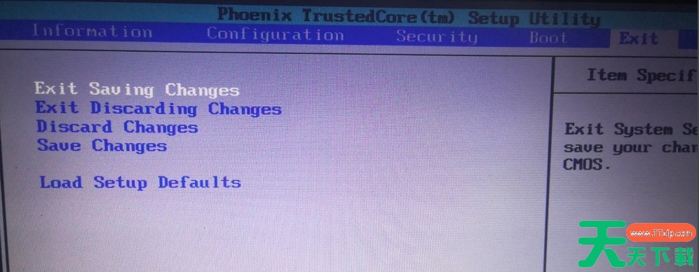 3、再移动到exit标签,找到退出并保存的选项,回车确认。
