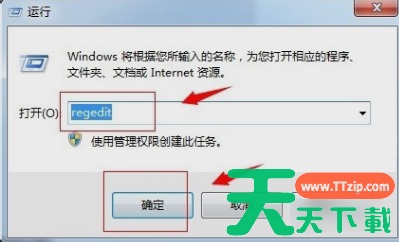 然后,在打开的运行窗口输入“regedit”,再点确定。