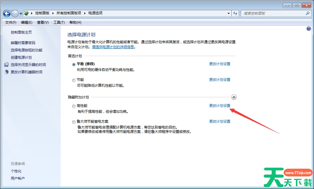 选取高性能电源计划,并点击右侧的更改计划设置;