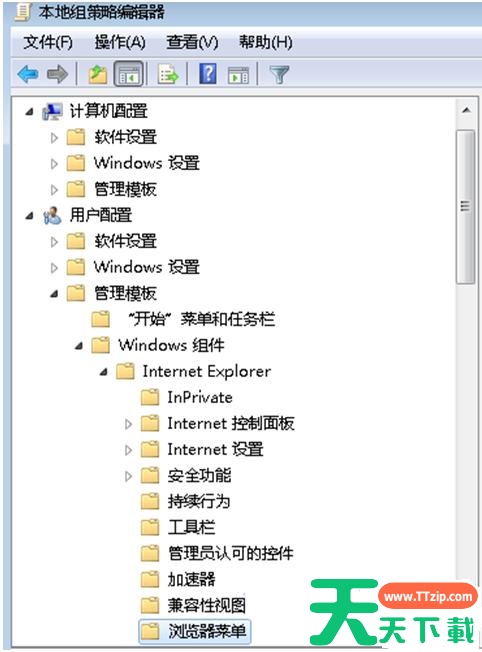 2、在打开的组策略编辑器窗口中依次展开“用户配置-管理模板-Internet explore-浏览器菜单”选项;