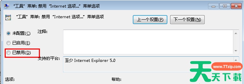 3、在右侧面板中找到“工具”菜单,禁止“Internet选项”,双击它,在打开的窗口中选择“已禁止”,之后退出组策略编辑器窗口即可。