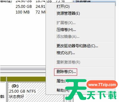 5、打开磁盘管理,找到与C盘相邻的分区,右键选择“删除卷”选项删除此分区(在删除前记得备份分区里的资料)。