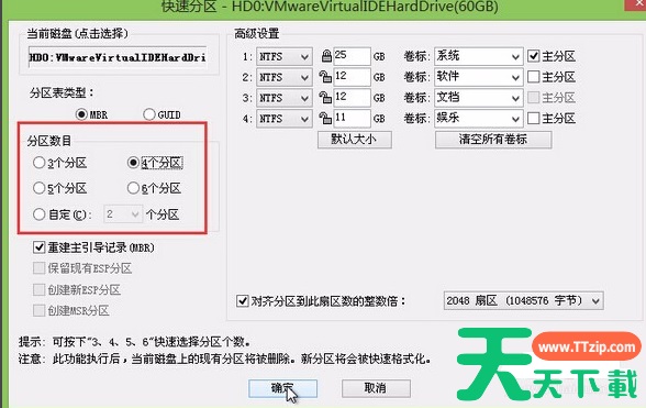 2、在弹出的窗口中,选择您需要分配的磁盘分区数目,当然您也可以自定义选择数目,然后您可以在右边界面中设置磁盘的大小和卷边,设置完成后点击【确定】即可。