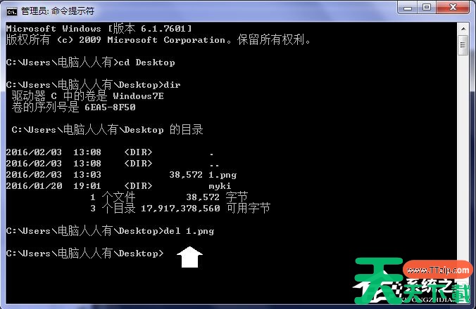 7、再使用del命令(按回车执行)删除即可(两者之间有空格),桌面上的图标就会没有了;