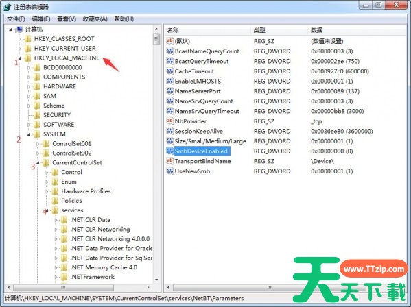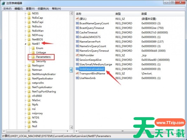 2、找到注册表项“HKEY_LOCAL_MACHINESystemControlsetServicesNetBTParameters”。