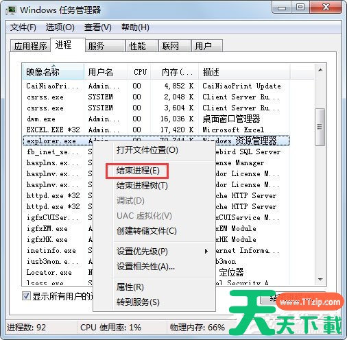 2、鼠标右击,结束explorer.exe进程;
