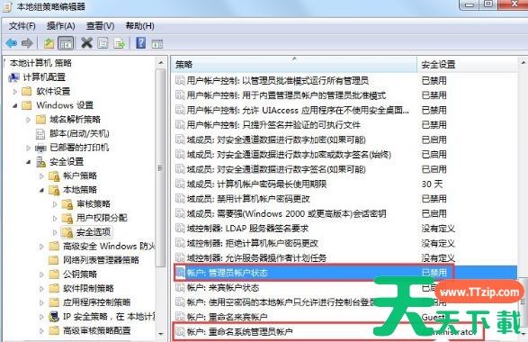 5、打开安全选项后,我们会发现“帐户:管理员帐户状态”这个账户的状态被禁用了,这里我们要启用一下它即可,而且我们还可以对管理员进行命名,这里就看你需不需要了。