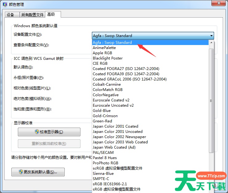 3、在高级选项中第一个 Windows 颜色系统默认值选项中,您可以看到有一个系统默认设置配置文件,提示内存出现问题的原因就在这里。在这里我们选择为 Agfa:Swop Standard 即可。