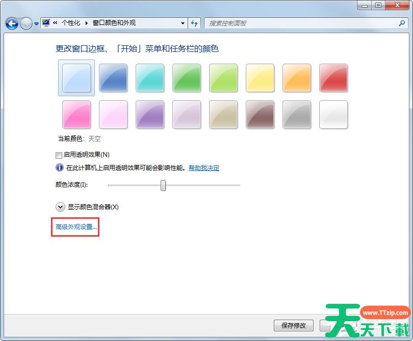 3、点击窗口颜色以后进入到窗口颜色和外观窗口,在窗口上面可以选择喜欢的颜色和颜色浓度;