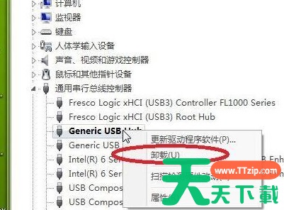 2、找到对应USB接口(如果不知道哪个是USB接口可以选择一一尝试),找到后右击点击“卸载”按钮;