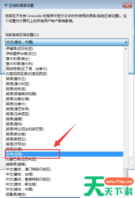 5、修改语言,下拉选择【英语(英国)】,接着点击【确定】,然后重启电脑;
