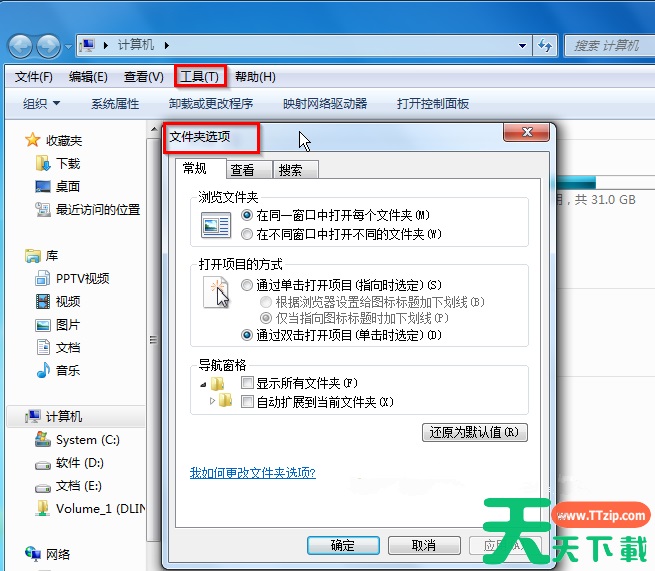 1、打开任意窗口(非IE窗口),然后依次点击上方的“工具---文件夹选项----文件类型”。