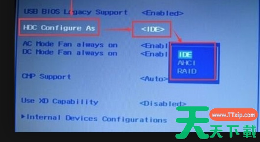 3、进入bios页面后,我们选择advanced选项通过方向键,并找到HDC configure as,按下回车键选择 AHCI 选项后,再按下回车键。
