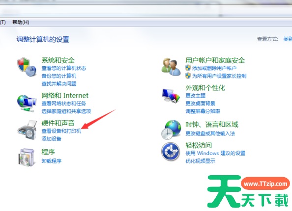 1、首先将打印机的相关线路跟电脑连接好,然后打开Win7旗舰版系统的控制面板,点击硬件和声音下方的查看设备和打印机选项,进入下一步。