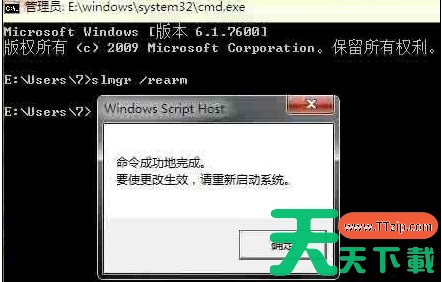 3、在开始菜单中搜索cmd,以管理员身份打开后,输入slmgr /rearm,回车后等待确认框出现: Windows7安装错误0XC004F061。