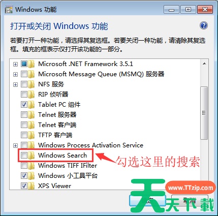 4、在Windows功能中,我们找到Windows搜索,将其选中,然后单击确定。
