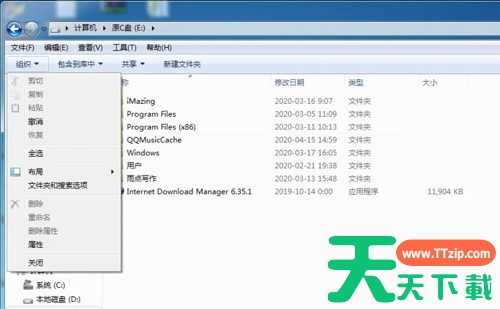 1、进入win7系统后,随便打开一个文件夹,点击界面上方的组织按钮,选择文件夹和搜索选项打开,进入下一步。