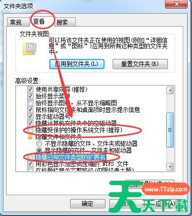 2、在打开的文件夹选项界面中切换到查看选项,在高级设置界面中找到“隐藏受保护的操作系统文件(推荐)”和“隐藏已知未见类型的扩展名”这两个选项前面的勾选去除,然后勾选“显示所有文件和文件夹”,点击应用并确定即可。