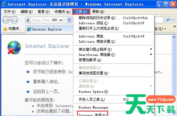 1、清除IE缓存,打开IE浏览器,在浏览器上方界面中点击【工具】,选择【Internet 选项】,进入下一步。