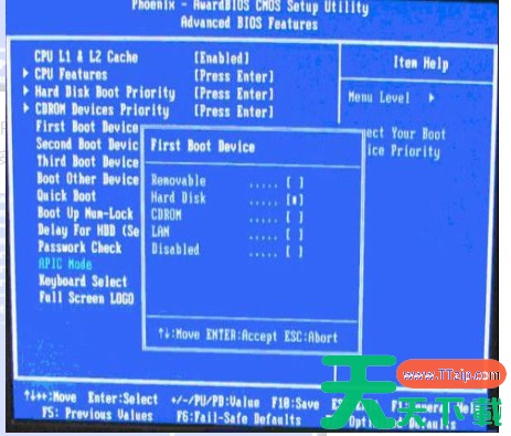4、再选择第一启动设备(First Boot Device):该版本的BIOS这里没有U盘的“USB-HDD”、“USB-ZIP”之类的选项,经尝试选择移动设备“Removable”不能启动,但选择“Hard Disk”可以启动电脑 。