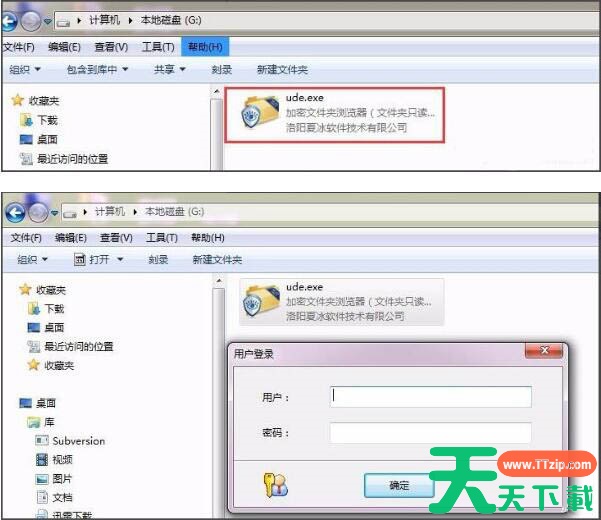 7、打开加密G盘,看到的是一个客户端,双击客户端,在弹出的窗口输入密码就可以打开加密G盘了,admin是管理员账户,输入此账号和密码可以进行所有的操作,输入设置的普通用户,只能进行相应权限的操作。如图所示: