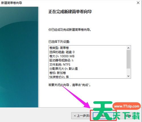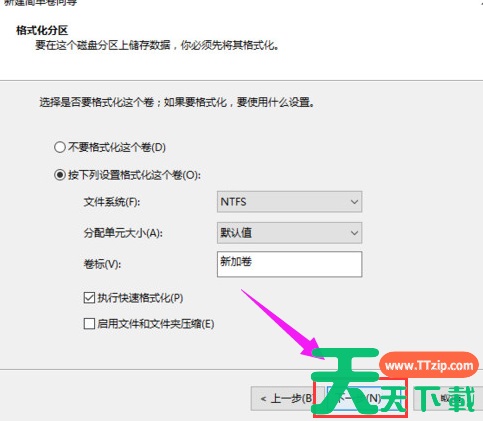 为新建的简单卷选择磁盘的格式,一般选择“NTFS”就好了。