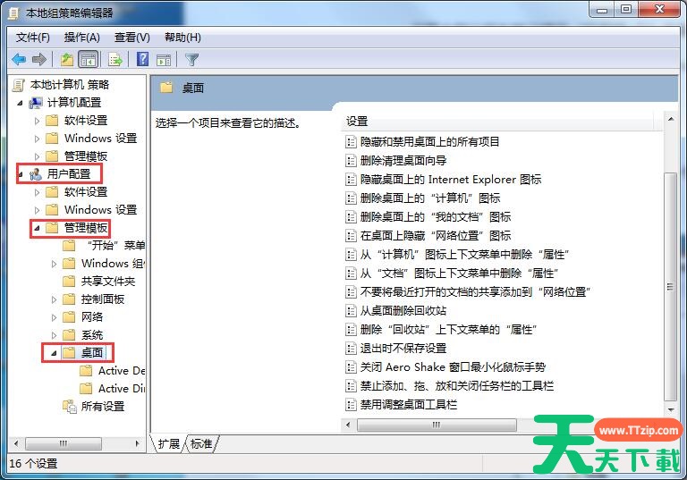 3、依次打开“用户配置→管理模块→桌面”;