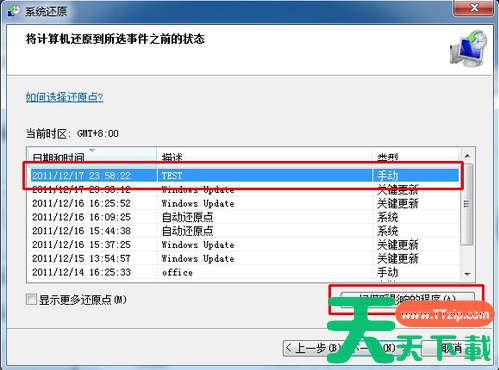 3、最后只要选择最近手动设置过的还原点以及其他自动的还原点都可以,但是最好下一步之前点击“扫描受影响的程序”按钮。