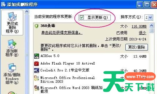 2、然后依次点击“开始”--“设置”--“控制面板”,打开“添加或删除程序”,然后勾选“显示更新”。