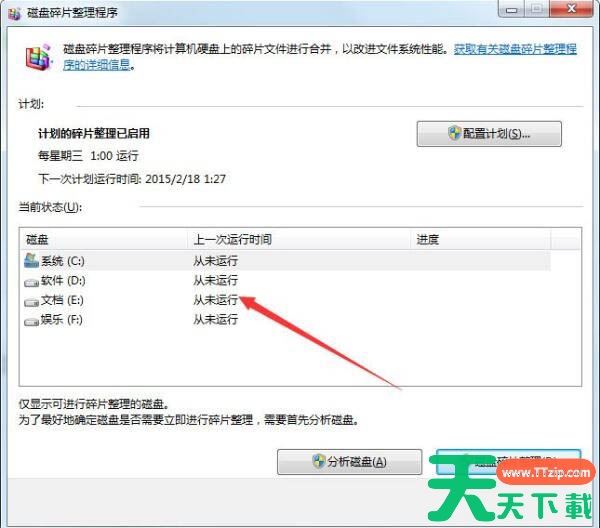 3、进入磁盘碎片整理界面选择磁盘点击右下方的磁盘碎片整理,等待整理完毕;如图所示: