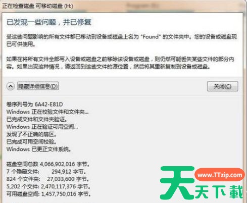 4、如果想知道具体出现什么问题,可以单击“查看详细信息”,在其列表中会显示出修复的具体内容和情况,可以查看到是扇区和文件系统有点问题。