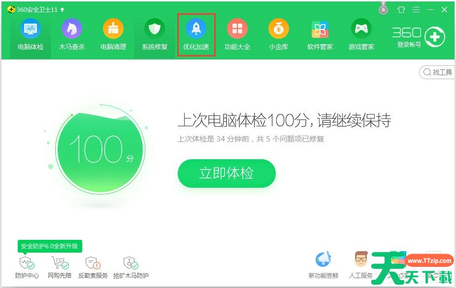4、点开360安全卫士,找到“优化加速”,并点击;