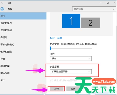 4,多显示器那边选择扩展这些显示器。点击应用。