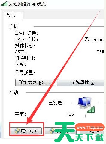 4、在弹出的无线网络连接状态窗口点击属性打开。