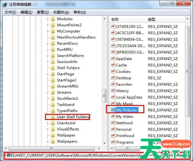 2、进入注册表编辑器窗口后,在左侧依次展开“HKEY_CURRENT_USER\Software\Microsoft\Windows\CurrentVersion\Explorer\User Shell Folders”,然后在右侧双击打开“My Pictures”字符串值;