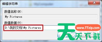 3、进入编辑字符串窗口后,将“数值数据”修改为“D:\我的文档\My Pictures”,点击确定,然后在“D:\我的文档”目录下创建“My Pictures”文件夹即可。