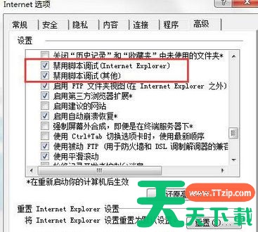 3、进入“高级”界面页,在设置中,找到【禁止脚本调试(Internet)】【禁止脚本调试(其他)】勾选,点击保存;