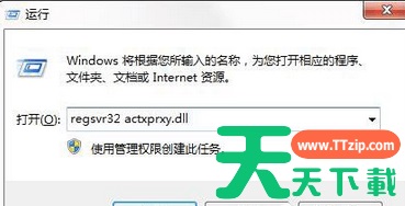 2、在弹出的【运行】对话框输入:regsvr32 actxprxy.dll,点击确定;