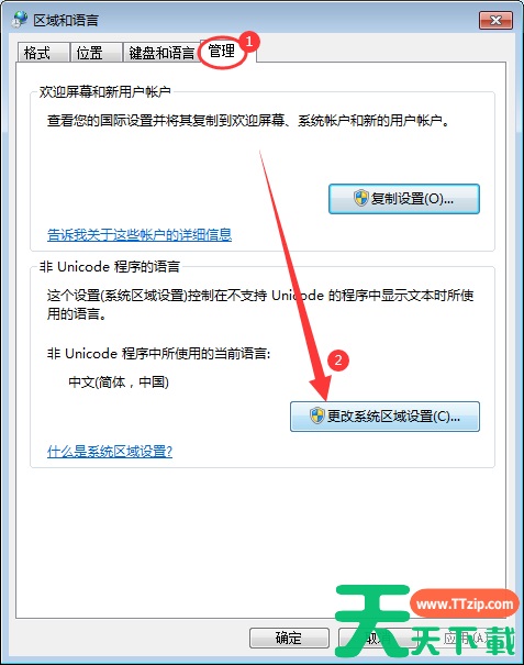4、区域和语言窗口,切换到管理选项卡,然后点击下方更改系统区域设置;