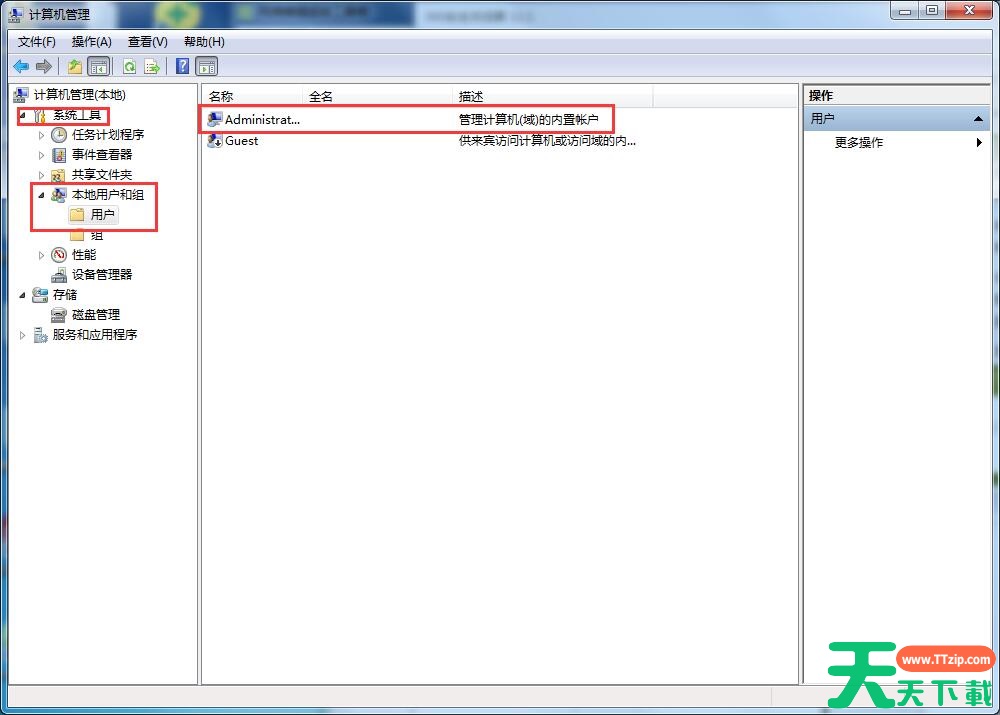2、进入计算机管理页面,依次选择“计算机管理(本地)→ 系统工具→本地用户和组→用户”,然后我们在右侧找到“Administrator”,双击打开就可以了。