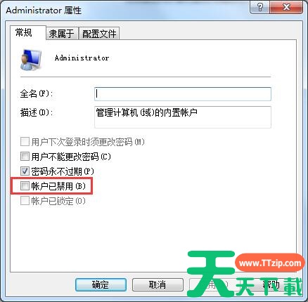 3、然后我们在打开的页面选择常规的栏目,然后我们去掉“账户已禁用”前的“√”,选择点击应用,点击确定就可以了。