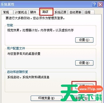 2、弹出的“系统属性”框中选择“高级”,“启动和故障恢复”下面的“设置”。
