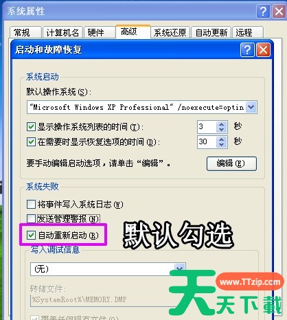 3、发现“系统失败”下的“自动重新启动”是默认勾选的。