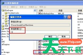 7、在右边窗口找到并双击打开数值名称“PowerdownAfterShutdown”的字符串键值,将数值数据修改为“1”,设置完成户单击“确定”按钮。