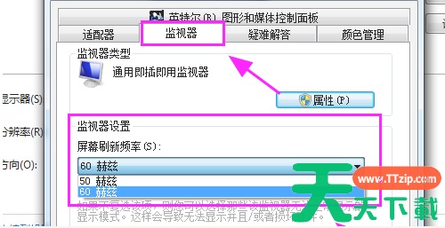 6、在”高级设置“的页面中,我们点击上方的”监视器“选项,点击后,在下方列表中选择合适自己显示器的刷新频率,再点击”应用“即可生效。